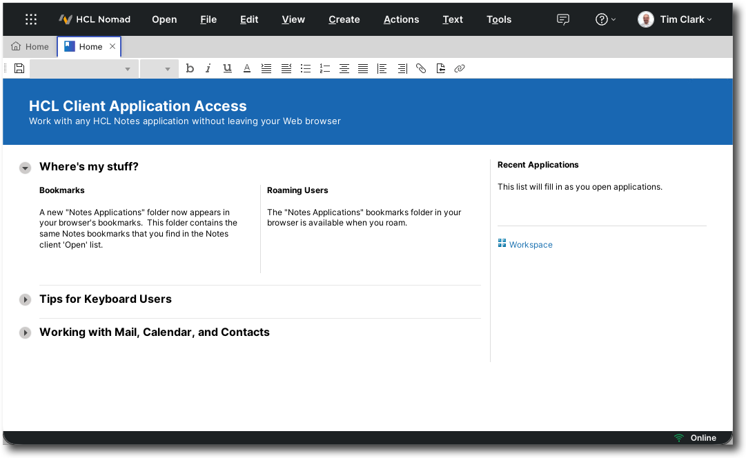 Opening bookmark.nsf in local displayes Welcome Page for IBM Client Application Access. Contents shall be replaced with useful one for DMA.