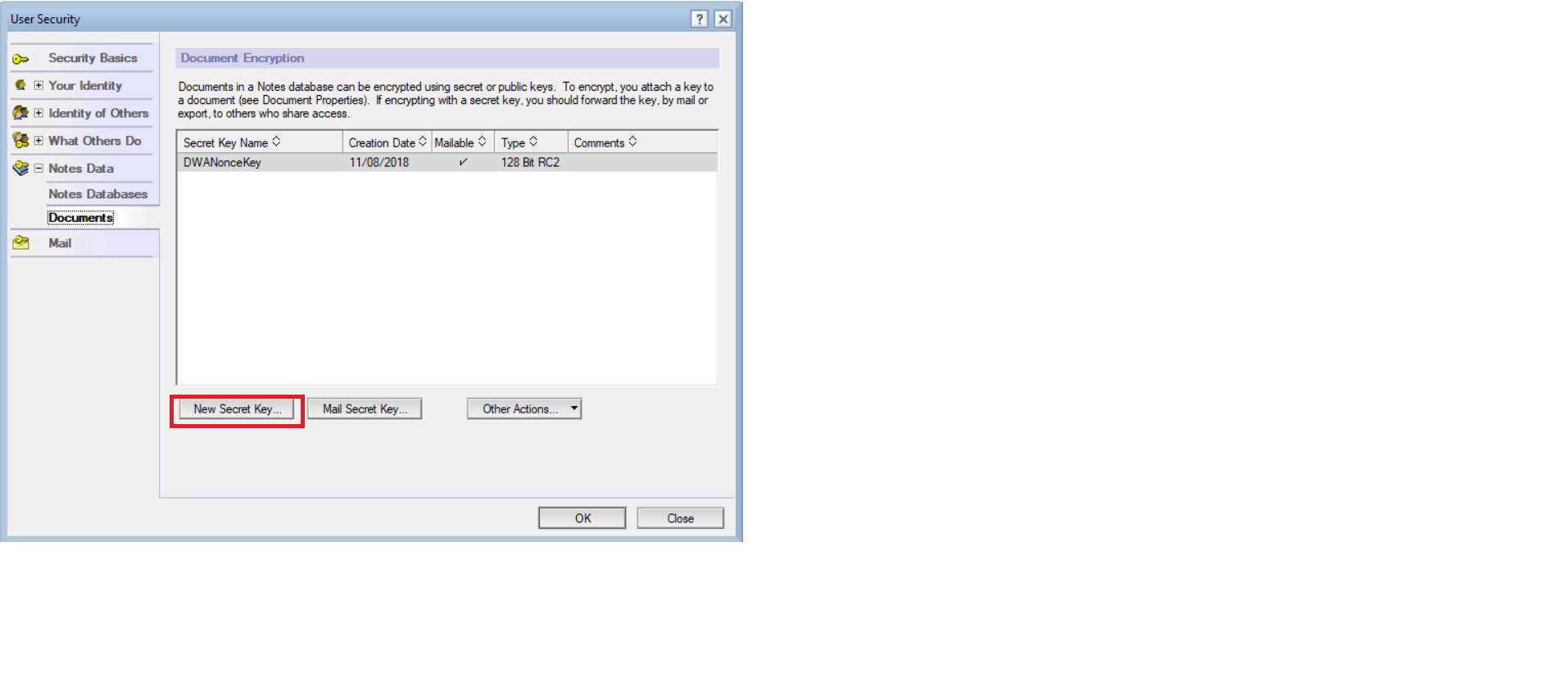 Using Notes client customer can add document encryption secret key. Some of customer applications require a Secret Key to view some of the applications' fields. Using notes client They have a option under File --->Security --> User Security --> Notes Data --> Document.
