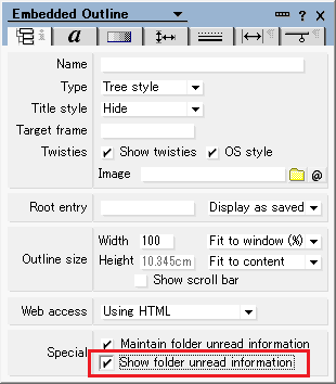 When "Show folder unread information" is checked in the properties of embedded outlines, the number of unread documents is displayed in the folder.