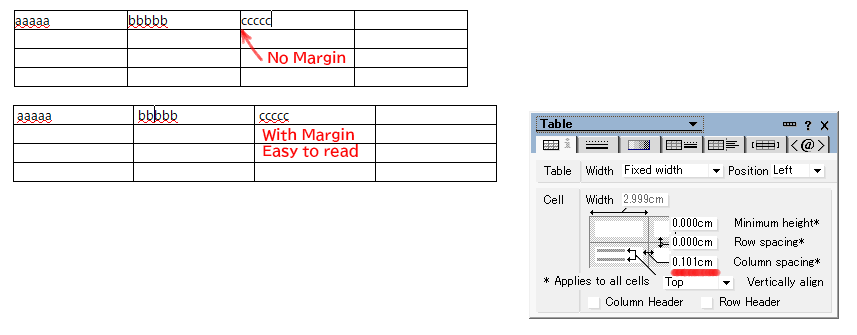 See attached image. Text margin in a table (cell) is zero as default. As you see, it does not looks good due to zero left/right margin. I think this is ugly. I always set it manually to 0.1cm (0.04 inch).