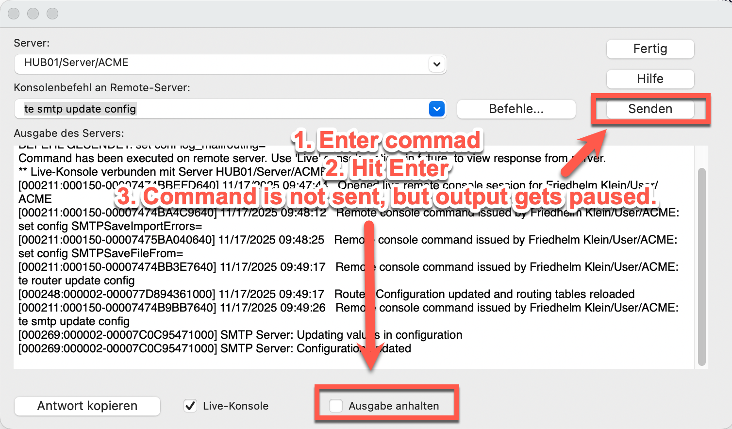 When you are running the server console from within Admin Central or by creating a smart icon running @Command([AdminRemoteConsole]), the dialog box does not default to "Send" when you hit <Return> after entering a command. Instead it toggles "Pause Output", which is really annoying. "Send" should be the default action on <Enter>